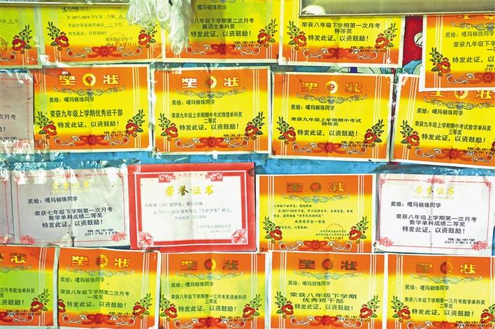 那嘎村脫貧戶扎西多吉家的獎(jiǎng)狀墻。