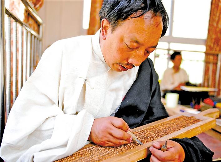 江達(dá)波羅古擇木刻技藝自治區(qū)級傳承人朗加。