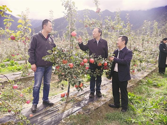 圖為國(guó)家蘋果產(chǎn)業(yè)技術(shù)體系首席科學(xué)家霍學(xué)喜(中)在米林縣羌納蘋果示范基地現(xiàn)場(chǎng)開展技術(shù)指導(dǎo)。記者 李梅英 攝