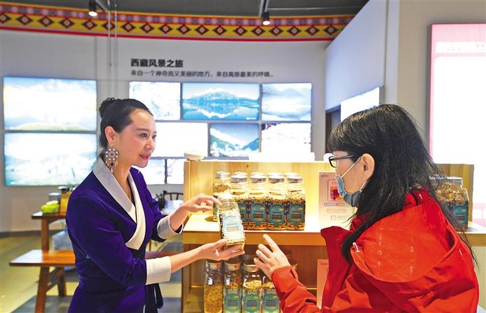 開館當(dāng)日,展銷人員身著盛裝詳細(xì)介紹了來自雪域高原的類烏齊牦牛肉干、卡若香豬臘肉、水磨糌粑、那曲蟲草、索多西辣椒醬、達(dá)美擁葡萄酒、察雅蘋果醋等300余種西藏特色農(nóng)特產(chǎn)品和易貢藏刀、丁青象牙玉器、墨脫石鍋、左貢木碗、藏毯、藏靴、藏香等近100種民族手工藝品,琳瑯滿目的民族特色產(chǎn)品吸引了不少市民駐足選購。
