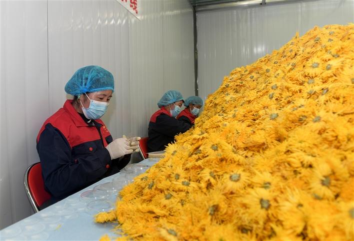 圖為經(jīng)過(guò)培訓(xùn)的崗巴縣崗巴鎮(zhèn)群眾在金絲皇貢菊種植基地內(nèi)工作。記者 潘多 唐斌 攝