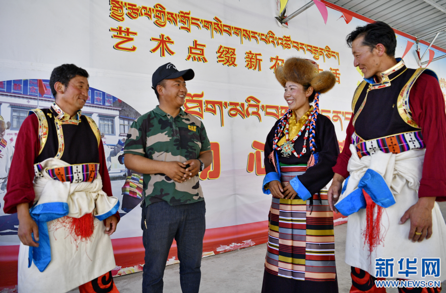西藏山南市扎囊縣桑耶鎮(zhèn)乃卡村第一書記、駐村工作隊(duì)隊(duì)長(zhǎng)次仁羅布(左二)和村文藝演出隊(duì)演員交流(2020年7月7日攝)。新華社記者 張汝鋒 攝