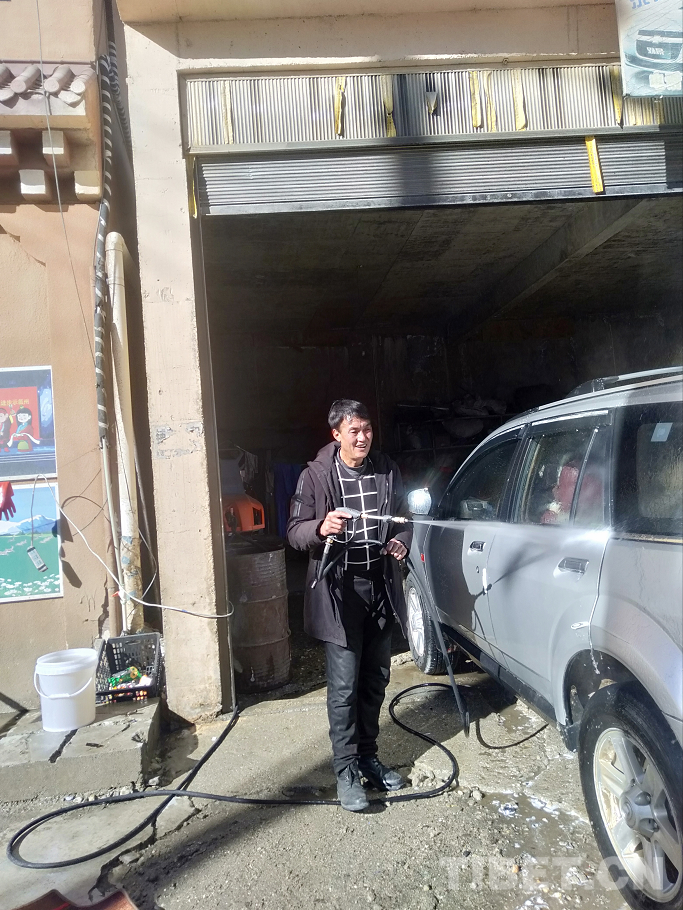 中國西藏網(wǎng)訊 高壓水槍洗車、擦車、整理車內(nèi)衛(wèi)生……2021年1月1日,四川省甘孜藏族自治州理塘縣濯桑鄉(xiāng)易久村搬遷至縣城的原貧困戶降央多丁在自家的洗車店忙得不亦樂乎。