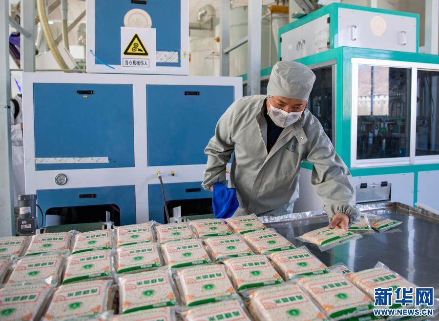 西藏拉薩達孜工業(yè)園區(qū)一家青稞食品生產企業(yè)的工作人員在擺放加工好的青稞產品(2020年2月17日攝)。新華社記者 孫非 攝