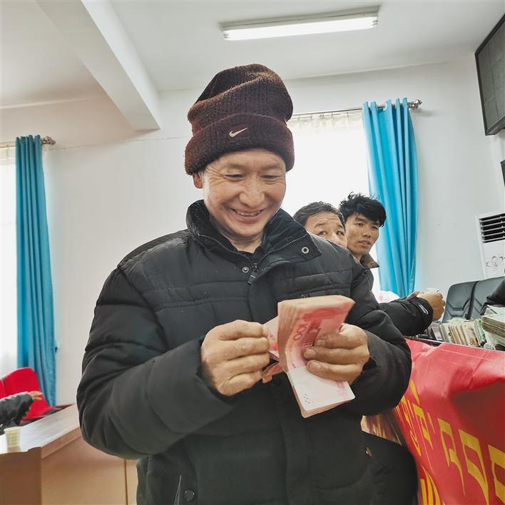 圖為卡瑪村村民斯塔次旦在合作社開心地?cái)?shù)著自己的分紅和工資。記者 曲珍 萬靖 攝