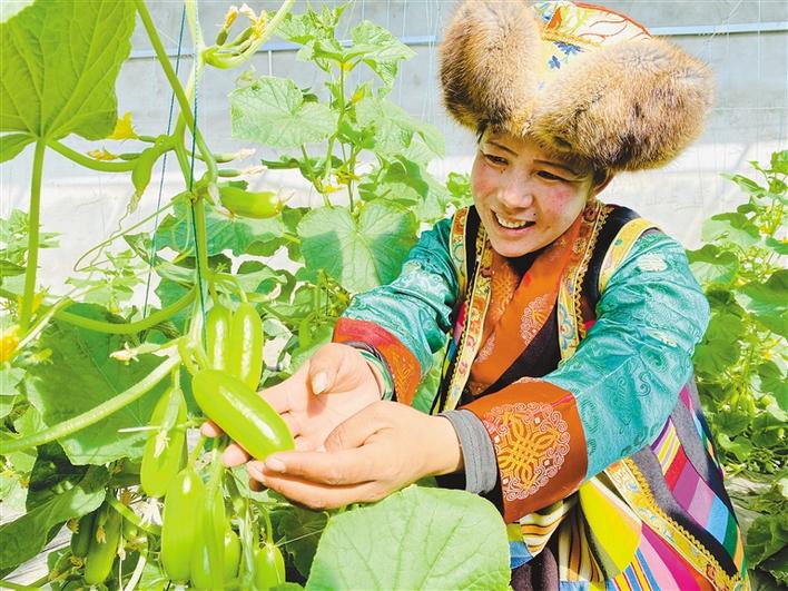 圖為山南市瓊結縣相達村村民次仁措姆在基地內采摘拇指黃瓜。倫珠澤仁 記者 洛桑 攝