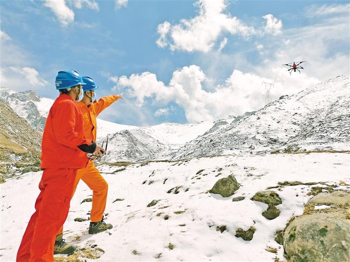 圖為國網(wǎng)西藏電力有限公司檢修公司兩名員工用無人機巡視220千伏墨山線。 王嘯天 記者 拉巴桑姆 攝