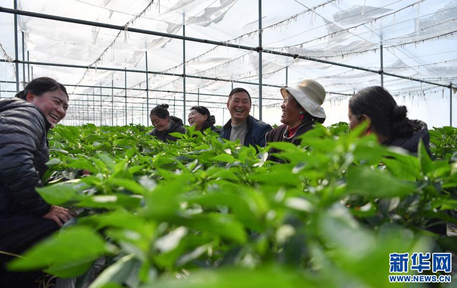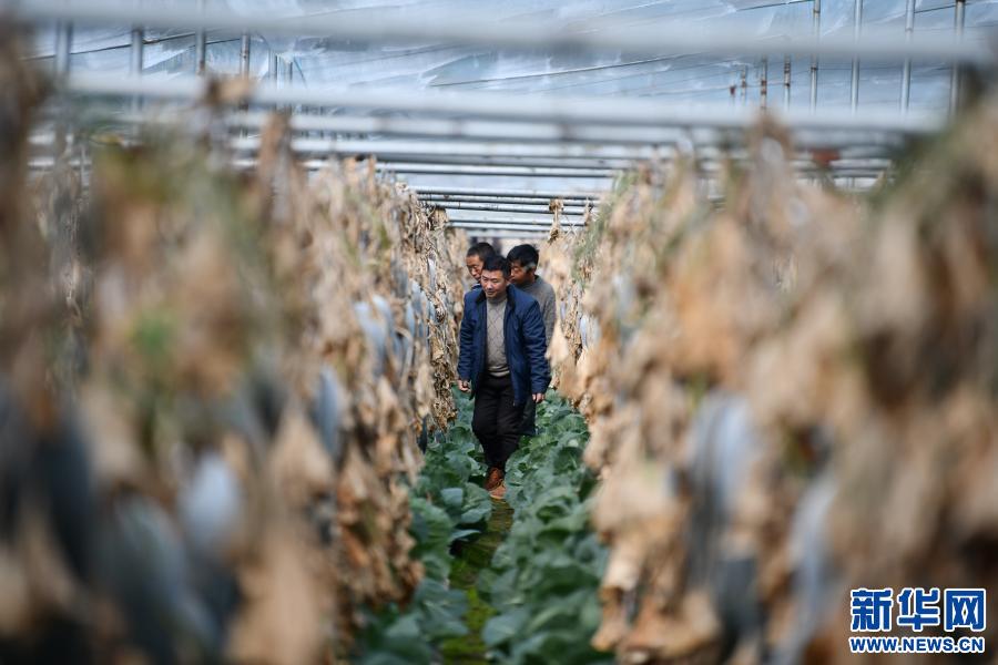 陳千(前)和種植戶在大棚里查看蔬菜長勢(shì)(2月25日攝)。新華社記者 晉美多吉 攝