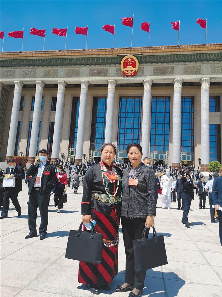 圖為貢覺曲珍(左)在會(huì)場外與西藏參會(huì)委員合影留念。(圖片由貢覺曲珍提供)