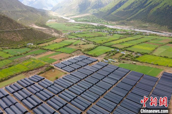 圖為航拍波密縣傾多鎮(zhèn)聯(lián)村共建產(chǎn)業(yè)示范園區(qū)的靈芝大棚?!〗w波 攝