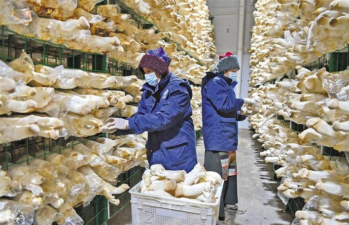 日喀則市珠峰一見則喜生物科技示范園區(qū)內工作人員在采摘杏鮑菇。