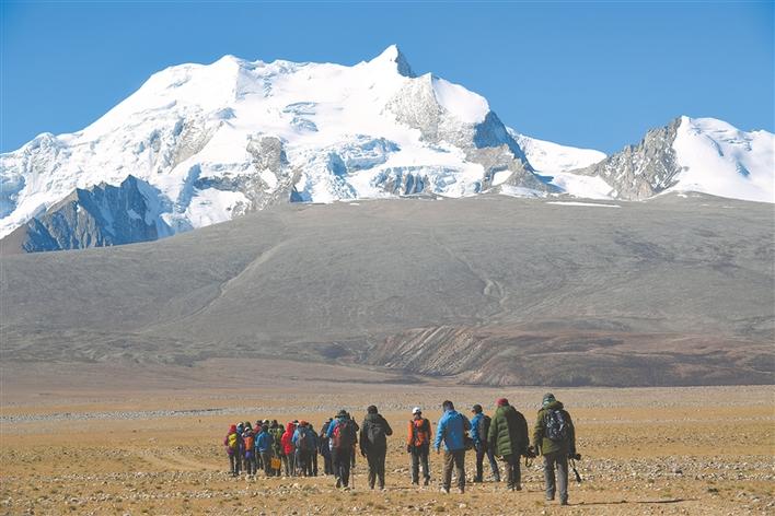 圖為希夏邦馬雪山下,戶外運(yùn)動的人們在向?qū)ьI(lǐng)下徒步。記者 李洲 攝