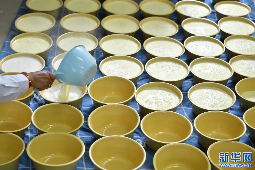 西藏娘亞牦牛養(yǎng)殖產(chǎn)業(yè)發(fā)展有限責任公司的員工在制作傳統(tǒng)手工酸奶(7月28日攝)。新華社記者 李鑫 攝