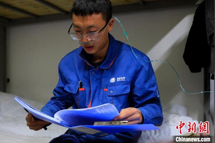圖為付新程完成當日的檢修工作,在宿舍內(nèi)一邊吸氧氣,一邊研究工作方案。 孟瑋 攝
