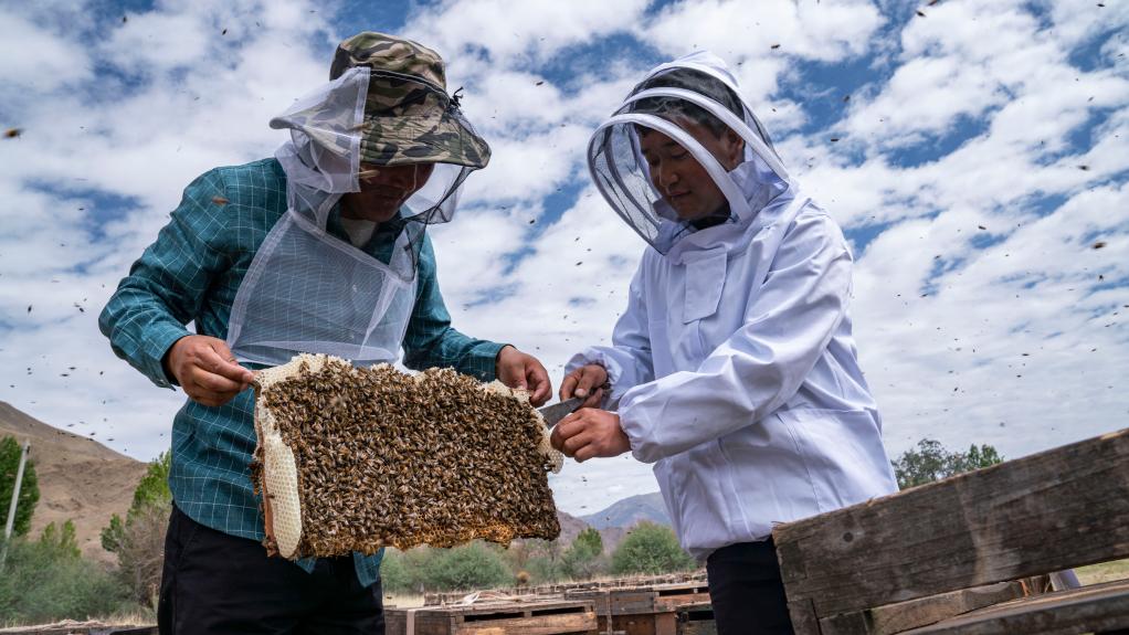 夜伴蜂聲有限公司的技術(shù)員(右)正在教授山南市錯(cuò)那縣覺拉鄉(xiāng)村民普巴占堆蜜蜂養(yǎng)殖技術(shù)。新華社記者 孫非 攝