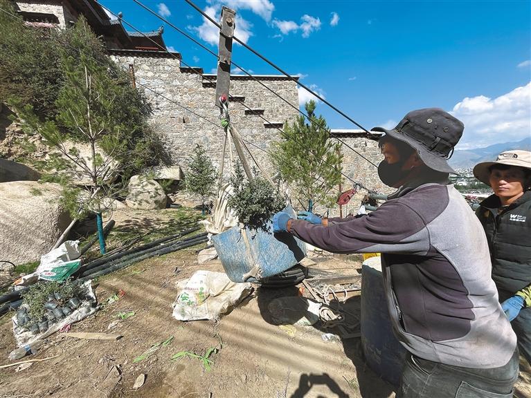 圖為拉薩北山造林的施工人員正在運送樹苗。記者 次旺 攝