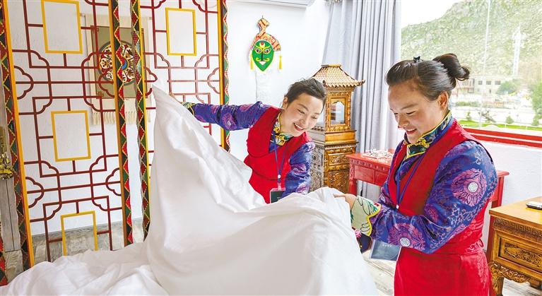 圖為搬遷入住堆龍德慶區(qū)德慶鎮(zhèn)的群眾在乃瓊街道波瑪村德吉藏家民宿就業(yè)。圖片由拉薩市鄉(xiāng)村振興局提供