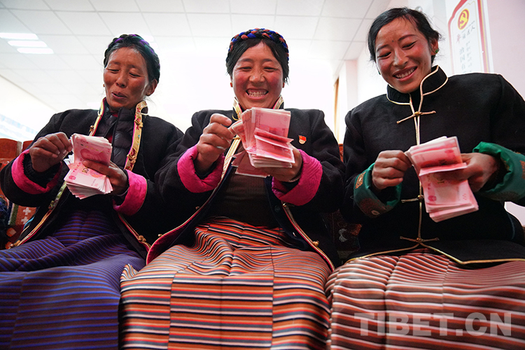 圖為領(lǐng)到工資的部分放牧員家屬正在數(shù)錢(qián)。攝影:曲杰