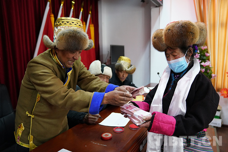 “普布達(dá)桑44565元、多吉扎西38750元、加央卓瑪2000元……”被叫到名字的村民和放牧員們紛紛上前領(lǐng)取入股后的第一次分紅。當(dāng)天牧場(chǎng)為12名放牧員和入股的102戶(hù)村民共發(fā)放了64.65萬(wàn)元的薪資和分紅款。