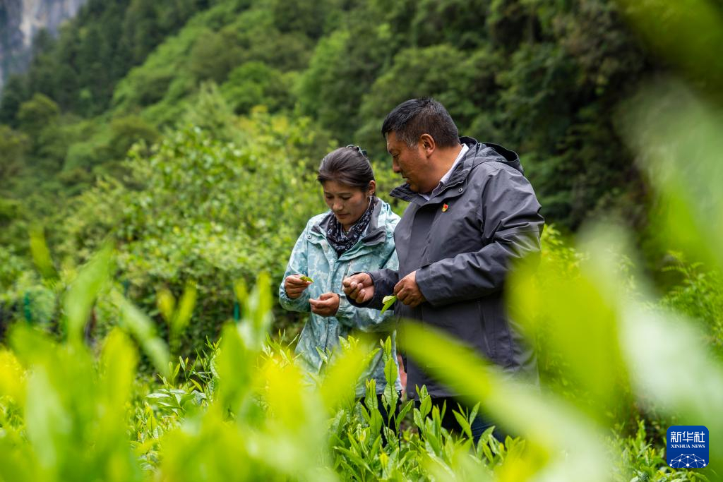 在勒門(mén)巴民族鄉(xiāng)的一處茶田,格桑旦增和女兒次仁旺姆正在查看茶葉生長(zhǎng)情況(2023年6月27日攝)。新華社記者 孫非 攝