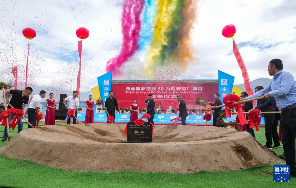 7月5日拍攝的拉薩市年產(chǎn)30萬(wàn)噸啤酒建設(shè)項(xiàng)目奠基儀式現(xiàn)場(chǎng)。新華社記者 晉美多吉 攝