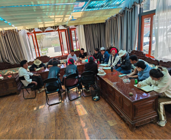 圖為駐村工作隊(duì)聽取村江多村獸藥物資需求會(huì)議現(xiàn)場。新華網(wǎng)發(fā) 舒啟航 攝