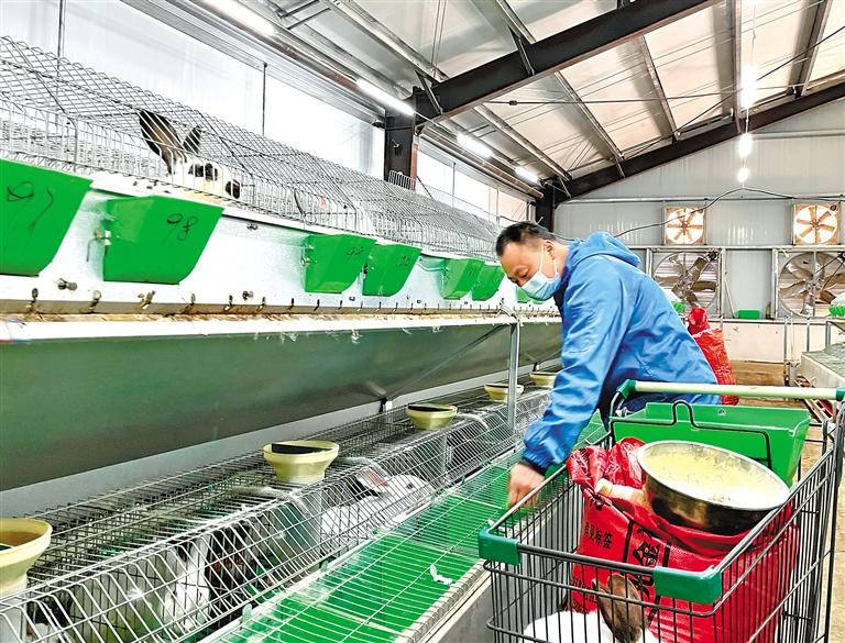 圖為拉薩市曲水縣才納鄉(xiāng)四季吉祥村獺兔養(yǎng)殖場(chǎng)的工人給兔子喂料。 記者 旦增蘭澤 攝