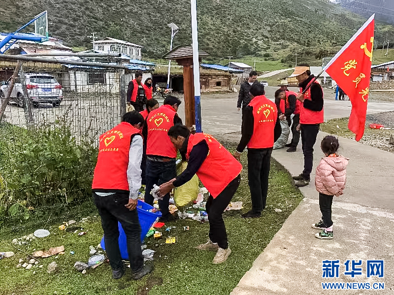 西藏昌都八宿縣然烏鎮(zhèn)來古村組織“冰川上的紅色家園”志愿服務隊開展環(huán)境整治活動(8月5日攝)。新華社發(fā)