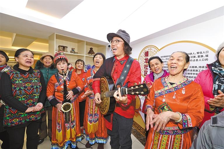 “蟠龍社區(qū)生活著漢族、壯族、瑤族等15個(gè)民族的同胞,少數(shù)民族人口約占社區(qū)總?cè)丝诘?/3。”蟠龍社區(qū)黨委副書記許玉君介紹說(shuō),社區(qū)結(jié)合多民族“嵌入式”居住的特點(diǎn),創(chuàng)新踐行“136”工作機(jī)制,即圍繞鑄牢中華民族共同體意識(shí)這條主線,通過(guò)加強(qiáng)黨的領(lǐng)導(dǎo)、織牢精神紐帶、用好治理平臺(tái)“三個(gè)抓手”,積極創(chuàng)造各民族共居共學(xué)、共建共享、共事共樂(lè)的“六共”條件,讓各族群眾像石榴籽一樣緊緊抱在一起?!拔沂菨h族,會(huì)做壯族的特色菜,我愛(ài)人是仫佬族,漢字書法練得有模有樣?!斌待埳鐓^(qū)藝術(shù)團(tuán)骨干何繼榮老人說(shuō)。