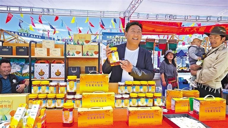 圖為在日喀則高原農(nóng)特產(chǎn)品及尼泊爾特色產(chǎn)品展示展銷(xiāo)活動(dòng)上,商家在展示自家產(chǎn)品。
