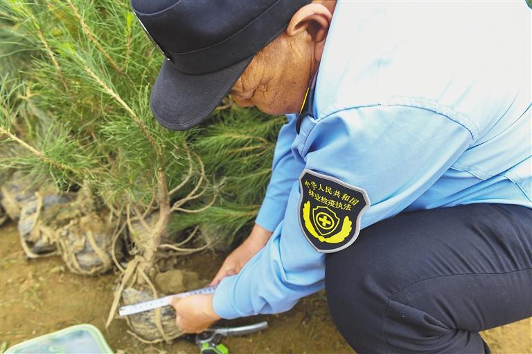 在拉薩南北山綠化工程2024年度鞏固提升(貢嘎機場周邊山體)工程項目上,林業(yè)檢疫執(zhí)法工作人員在檢查樹苗根部土球是否達標。 新華社記者 晉美多吉 攝
