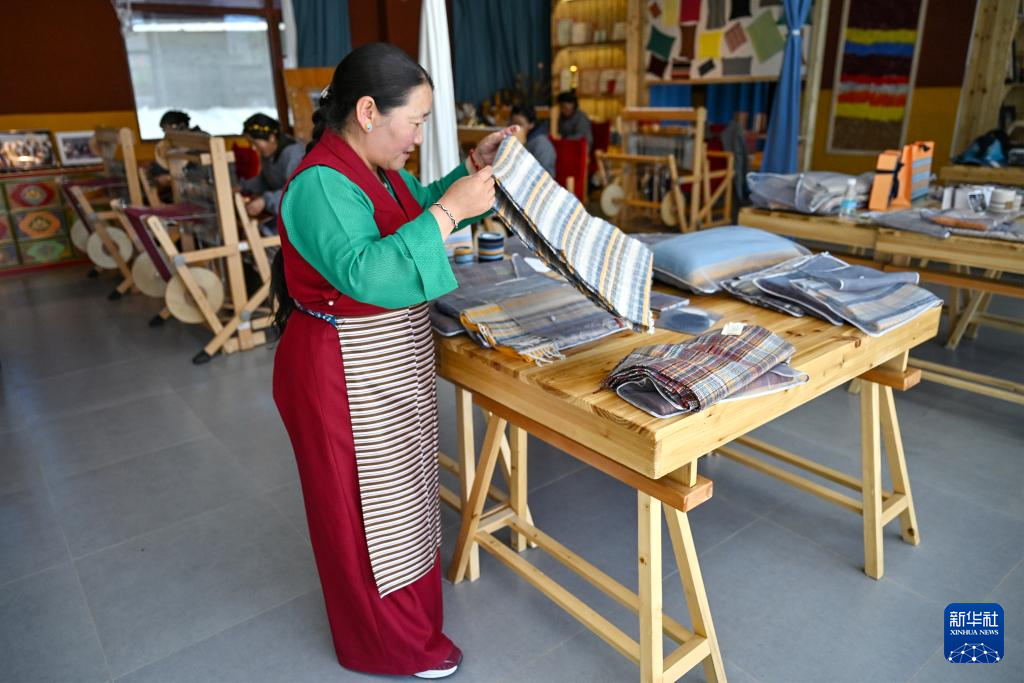在西藏日喀則市江孜縣班覺倫布村的阿佳格桑工坊,手工藝人阿佳格桑整理羊絨氆氌圍巾(9月3日攝)。新華社記者 孫瑞博 攝