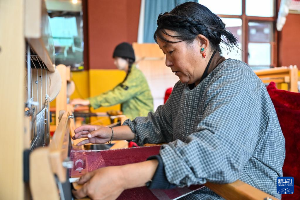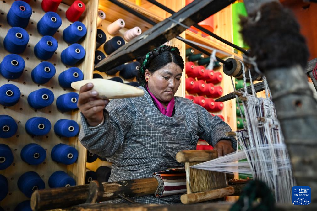 氆氌是藏族群眾用來(lái)制作藏式衣物的毛織品,其工藝迄今已有上千年歷史。在上海援藏幫扶下,這項(xiàng)傳統(tǒng)技藝如今已成為當(dāng)?shù)亍鞍⒓选保ú卣Z(yǔ)意為“大姐”)們的致富新途徑,煥發(fā)出新的生機(jī)。