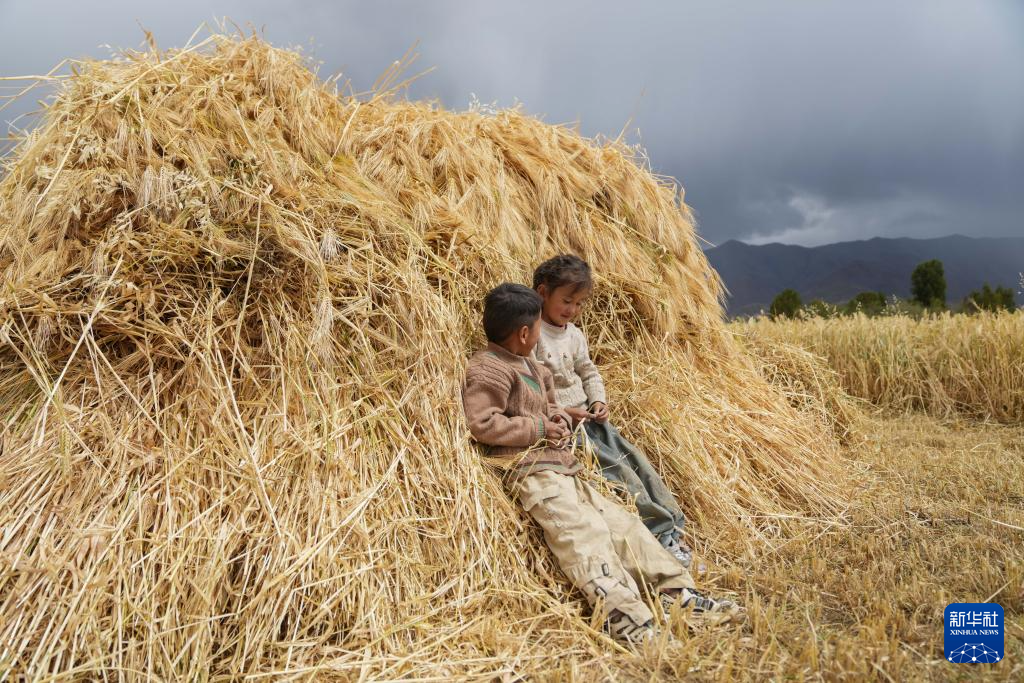 9月10日,在西藏日喀則市白朗縣巴扎鄉(xiāng),孩子們靠在青稞垛上玩耍。新華社記者 晉美多吉 攝