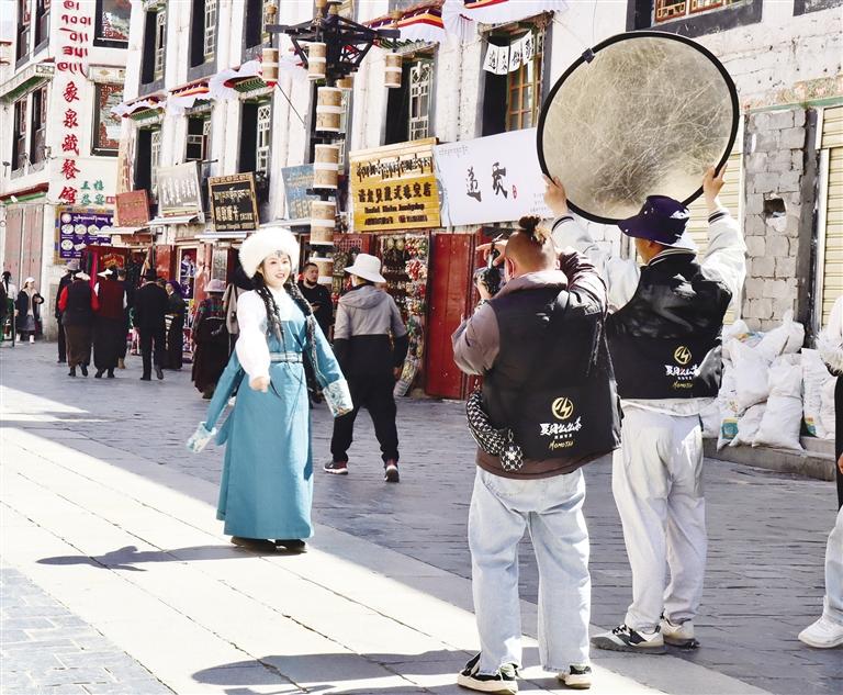 在八廓街體驗藏裝藝術(shù)照的游客。資料圖