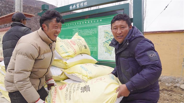 3月18日清晨,細碎的雪花如柳絮般輕柔飄落,墨竹工卡縣門巴鄉(xiāng)覆上了一層銀裝。門巴鄉(xiāng)巴爾卡村委會的院子里一片熱火朝天的景象,一袋袋飼草料和化肥整整齊齊地堆放在院子里,有的騎著摩托車,有的開著拖拉機,大家的臉上都洋溢著幸福的笑容,滿心期待著物資發(fā)放。