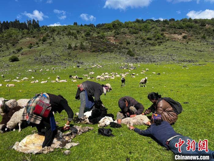 阿木姐弟(右二、右三)加入到剪羊毛的隊(duì)伍。時(shí)文枝 攝