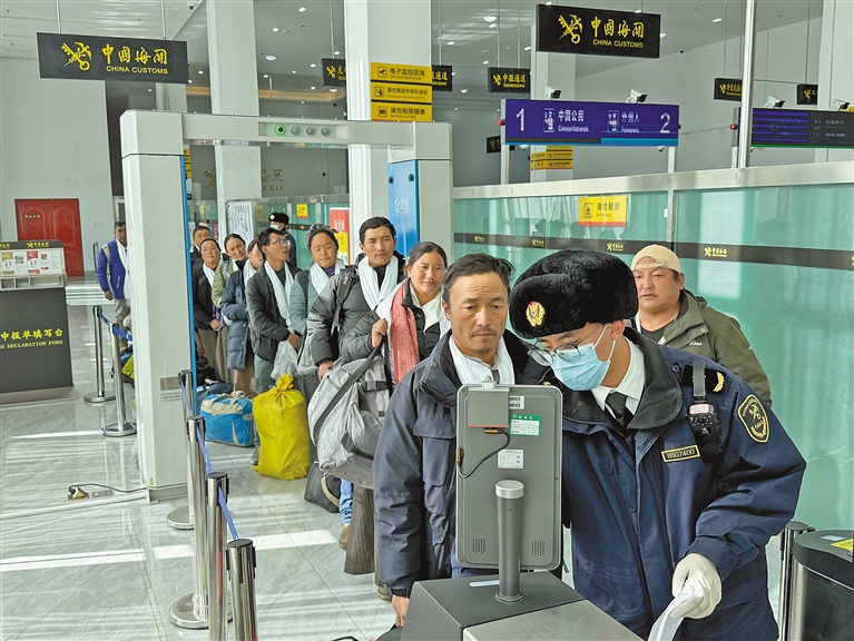 圖為拉薩海關所屬日喀則海關關員在里孜口岸開展監(jiān)管查驗工作,確保旅客入境順暢。圖/文 記者 李梅英