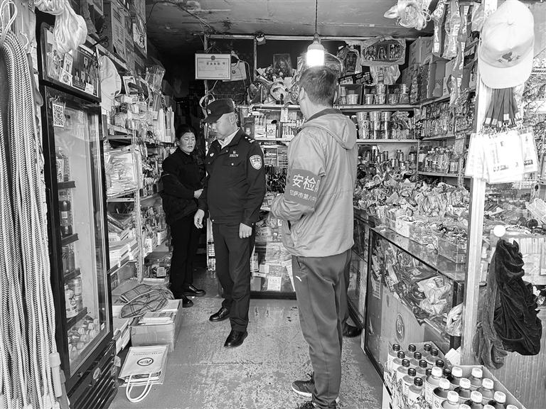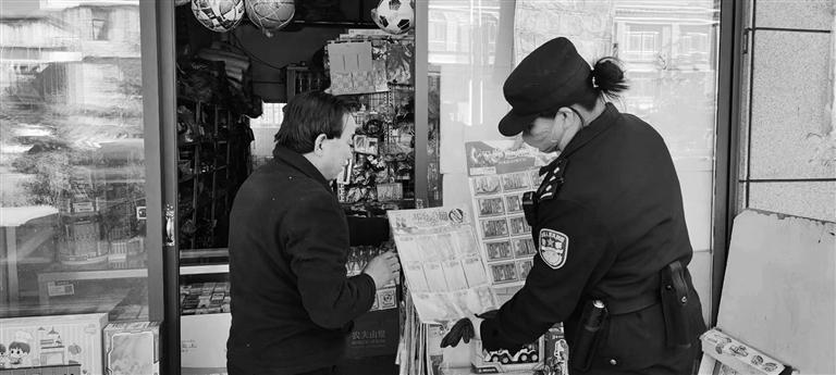 民警巡查學(xué)校周邊商鋪。
