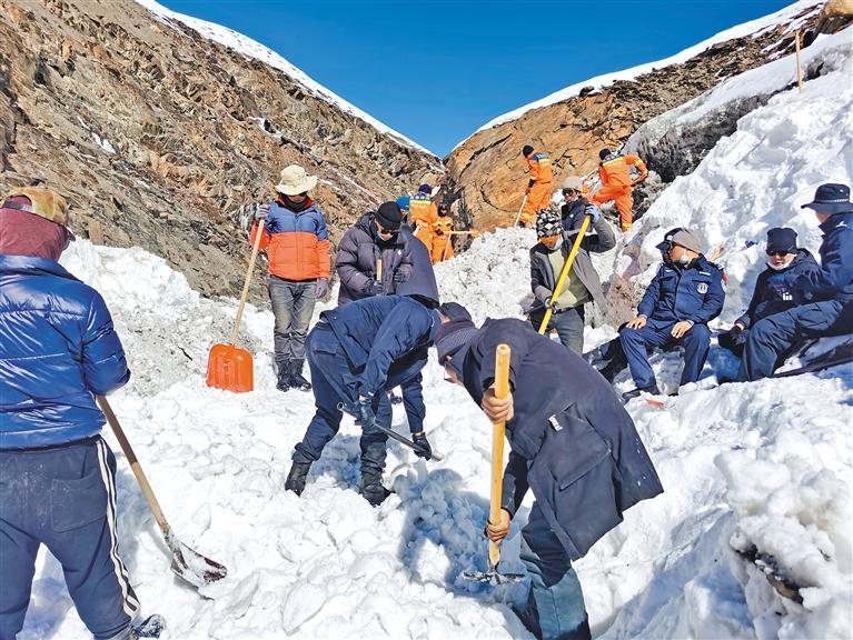 2022年10月底,洛扎縣突降大雪,農(nóng)牧民群眾的生命財產(chǎn)安全受到嚴重威脅,堅增羅布又一次向組織申請,主動前往自己熟悉的色鄉(xiāng)曲吉麥放牧點參與緊急救援工作。他在山谷中鏟雪、碎冰、清理河道,連續(xù)奮戰(zhàn)12天,竭力尋找失蹤牧民,成功轉(zhuǎn)運200多頭牦牛,最大限度維護了群眾生命財產(chǎn)安全。