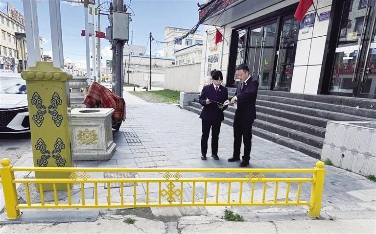 工作人員正在檢查路邊盲道存在的問題。通訊員 才仁拉珠 攝