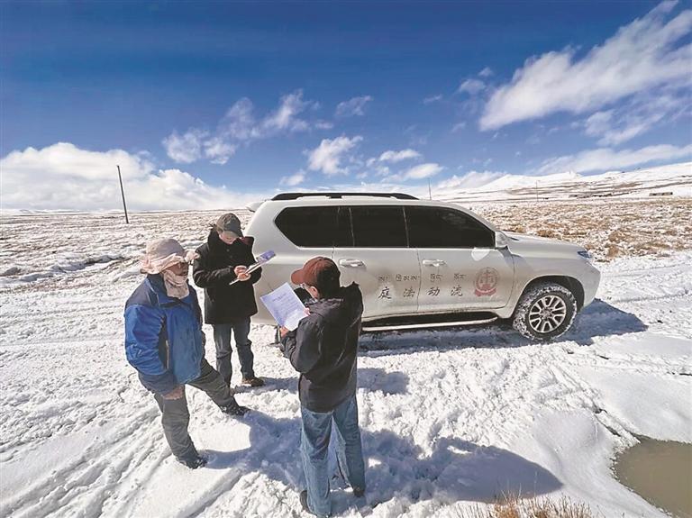 在雙湖縣,人民法院車載科技流動(dòng)法庭日行千里,加強(qiáng)與生態(tài)管護(hù)站、行政村協(xié)作,構(gòu)建“庭·站聯(lián)合”生態(tài)預(yù)警網(wǎng)格,及時(shí)發(fā)布司法保護(hù)令和環(huán)保倡議書。在安多縣,法院干警翻越唐古拉山,深入森布日生態(tài)搬遷安置點(diǎn),通過“加強(qiáng)聯(lián)絡(luò)暢渠道”工作法,與群眾促膝長(zhǎng)談,傾聽民意;雁石坪人民法庭干警還主動(dòng)加入格拉丹東“長(zhǎng)江第一滴水”志愿巡護(hù)隊(duì),聘請(qǐng)當(dāng)?shù)攸h員志愿巡護(hù)隊(duì)員擔(dān)任生態(tài)法治巡護(hù)聯(lián)絡(luò)員,凝聚保護(hù)青藏高原生態(tài)的法治合力。