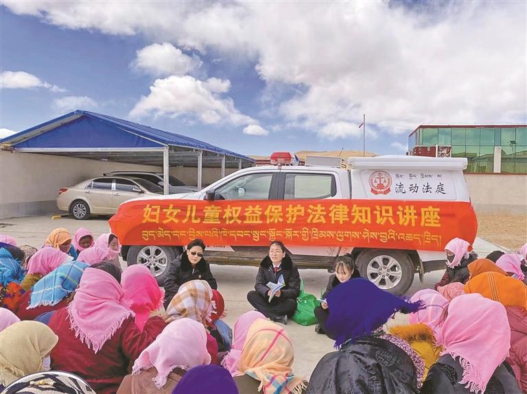 班戈縣人民法院青龍東嘎人民法庭依托流動(dòng)法庭開展婦女權(quán)益保障法專題法治講座。文/圖 記者 趙文慧 通訊員 巴色 次仁卓瑪