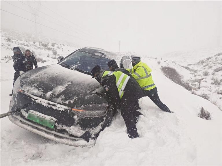 次日上午,業(yè)拉山路段一輛面包車(chē)因打滑深陷路邊溝谷,車(chē)內(nèi)兒童被凍得哭鬧不止,孩子母親急得直掉眼淚。民警吳紹軍見(jiàn)狀,立即脫下自己的警用大衣裹住孩子,耐心安撫一家人的情緒,隨后背起孩童,深一腳淺一腳地在積雪中跋涉,將一家人安全轉(zhuǎn)移至溫暖區(qū)域。