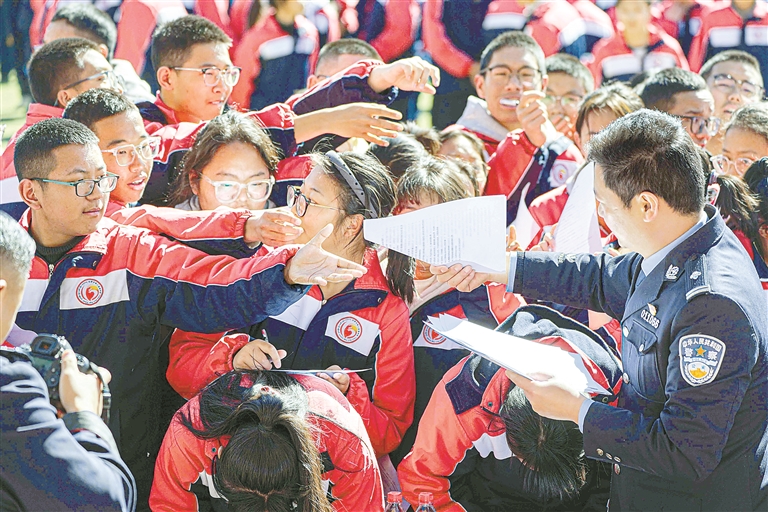 圖為西藏“開(kāi)學(xué)第一課”網(wǎng)絡(luò)普法進(jìn)校園活動(dòng)中,民警為學(xué)生發(fā)放普法宣傳知識(shí)手冊(cè)(資料圖片)。記者 貢曲羅杰 攝