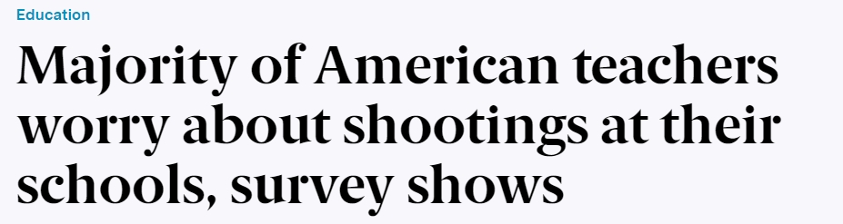 報(bào)道稱,2023年,美國發(fā)生的校園槍擊事件數(shù)量達(dá)到了歷史新高。在接受皮尤調(diào)查的受訪者中,59%的人對(duì)校園槍擊表示擔(dān)心,其中18%的人說自己對(duì)此感到“非常”或者“極度”擔(dān)心。只有7%的受訪教師稱,他們完全不擔(dān)心校園槍擊的發(fā)生。