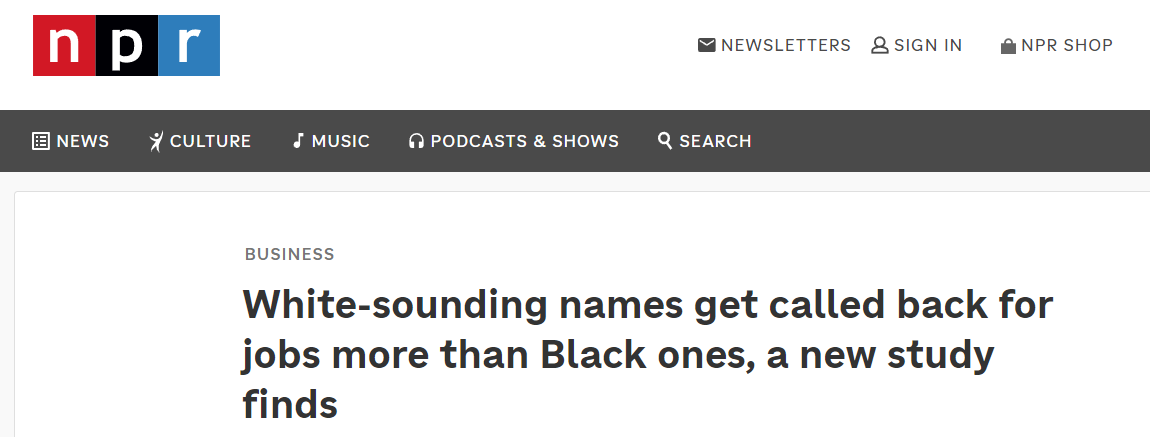 據(jù)美國全國公共廣播電臺(NPR)網(wǎng)站報道,研究人員向約100家美國企業(yè)的11000個初級職位投遞了履歷相同,但個人信息(姓名、性別等)不同的83000份“偽造”簡歷。研究發(fā)現(xiàn),名字聽起來“像白人”的求職者被招聘方回復的概率更高,比名字“像黑人”的求職者平均高9.5%。在一些情況更嚴重的企業(yè),這一差距上升到約24%。