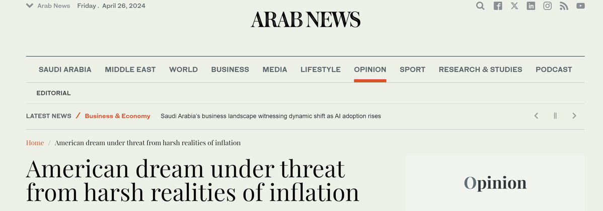 沙特阿拉伯媒體《阿拉伯新聞》網(wǎng)站4月24日刊發(fā)評論文章稱,美國通脹高企,物價不斷上漲,導(dǎo)致民眾的購買力持續(xù)下降,基本生活消費(fèi)品成為無力負(fù)擔(dān)的“奢侈品”?!懊绹鴫簟北粴埧岬默F(xiàn)實(shí)擊潰。文章批評美國政府對通脹危機(jī)的反應(yīng)嚴(yán)重不足,將黨派問題置于解決民眾的迫切需求之上,削弱了民眾的信任感。