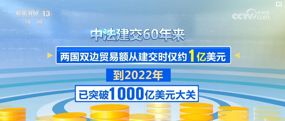 中法建交60年來,兩國雙邊貿易額從建交時僅約1億美元,到2022年已突破1000億美元大關。如今,法國是中國在歐盟內第三大貿易伙伴和第三大實際投資來源國,中國則是法國在亞洲第一大貿易伙伴。