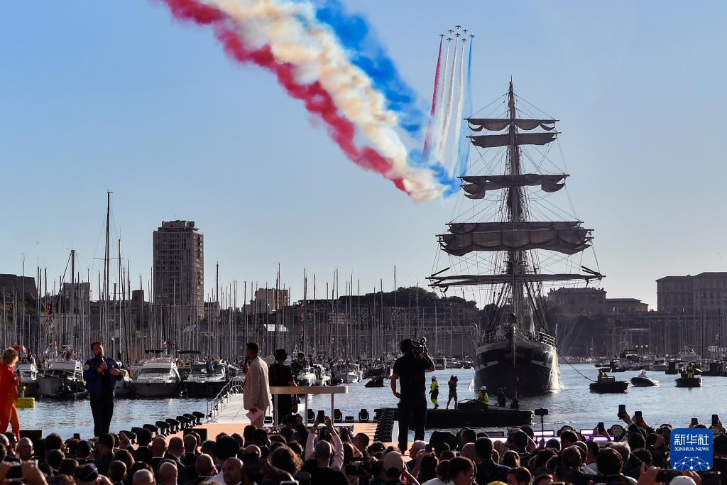 ??傍晚時(shí)分,伴隨著現(xiàn)場(chǎng)觀眾高唱法國(guó)國(guó)歌《馬賽曲》,“貝勒姆”號(hào)緩緩駛進(jìn)港口,著名的“法蘭西巡邏兵”飛行表演隊(duì)從港口上空呼嘯而過(guò),先后展示了奧運(yùn)五環(huán)與法國(guó)國(guó)旗的圖案。